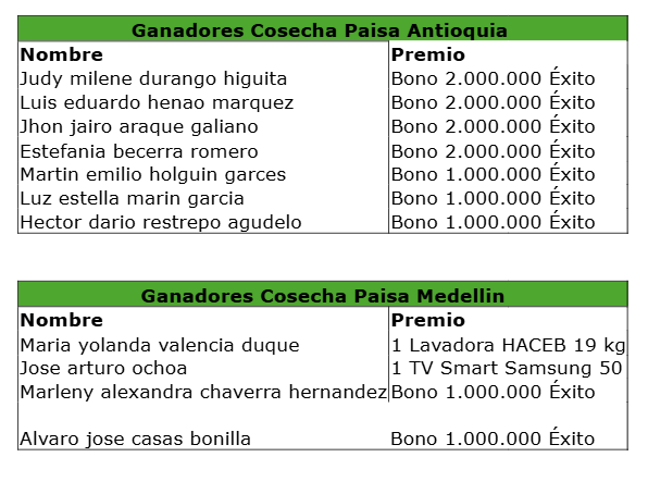 Estamos emocionados de compartir los Ganadores de sorteo cosecha Paisa . Gracias por participar